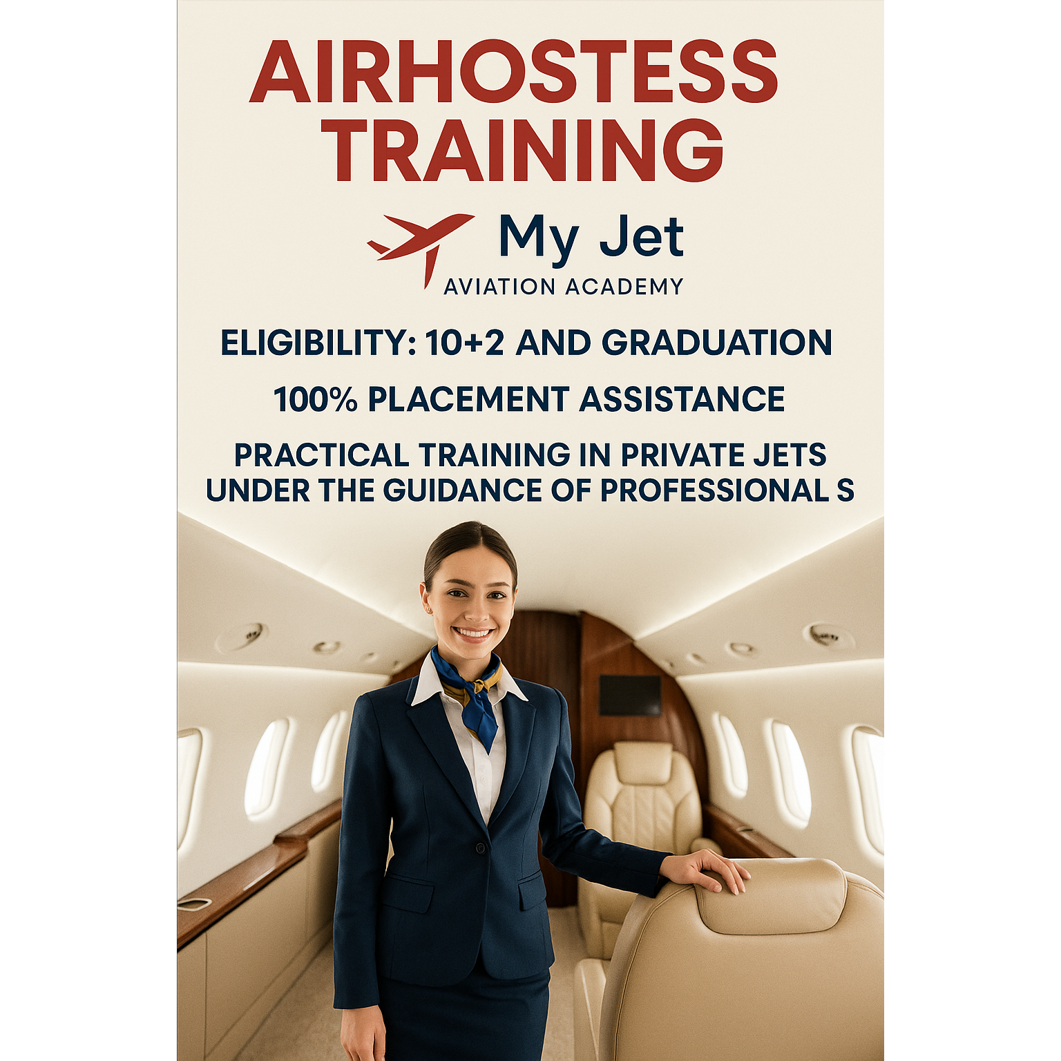 Airhostess Training for Your Aviation Career My Jet Aviation Academy, Noida. Turn your dream of flying high into a successful aviation career with our industry-designed Airhostess (Cabin Crew) Training Program. Its a high salary with fast growth, free flights & exclusive travel perks, Glamorous lifestyle with international exposure, Job opportunities in top airlines. Good Communication & Pleasing Personality, Career Opportunities After Training, Cabin Crew (Air Hostess / Flight Steward), Ground Staff: Customer Service Executive, Airlines Hospitality, Airport Retail, Height: 5'2' & above (female), 5'7' & above (male), Good Communication & Pleasing Personality, Career Opportunities After Training, Cabin Crew (Air Hostess / Flight Steward), Ground Staff, Customer Service Executive, Airlines Hospitality, Airport Retail, Airport Operations