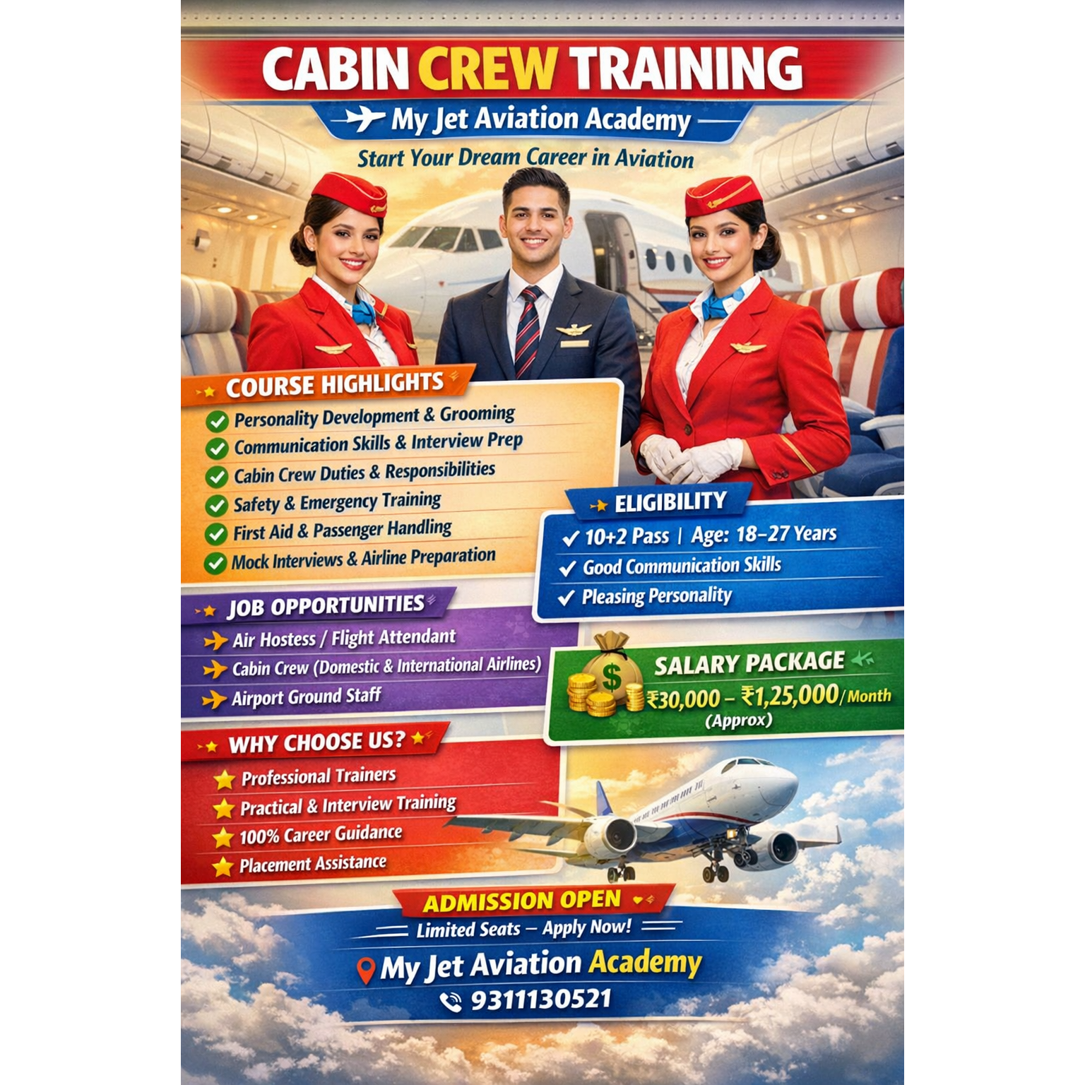 Best Aviation Academy in Noida (Barola) for Cabin Crew Training. Start Your Dream Career in Aviation with My Jet AVIATION ACADEMY. COURSE HIGHLIGHTS: Personality Development & Grooming, Communication Skills (English + Interview Prep), Cabin Crew Duties & Responsibilities, Safety & Emergency Training, First Aid & Passenger Handling, Mock Interviews & Airline Preparation (Cabin crew training covers safety, service, and real-flight situations to prepare you for airlines ) ELIGIBILITY: 10+2 Pass (Any Stream), Age: 18–27 Years, Good Communication Skills, Pleasing Personality (Most cabin crew courses in India require 12th pass and basic skills like communication & fitness ) JOB OPPORTUNITIES Air Hostess / Flight Attendant, Cabin Crew (Domestic & International Airlines), Airport Ground Staff SALARY PACKAGE ₹30, 000 – ₹1, 25, 000 / Month (Approx) (Depending on airline & experience )