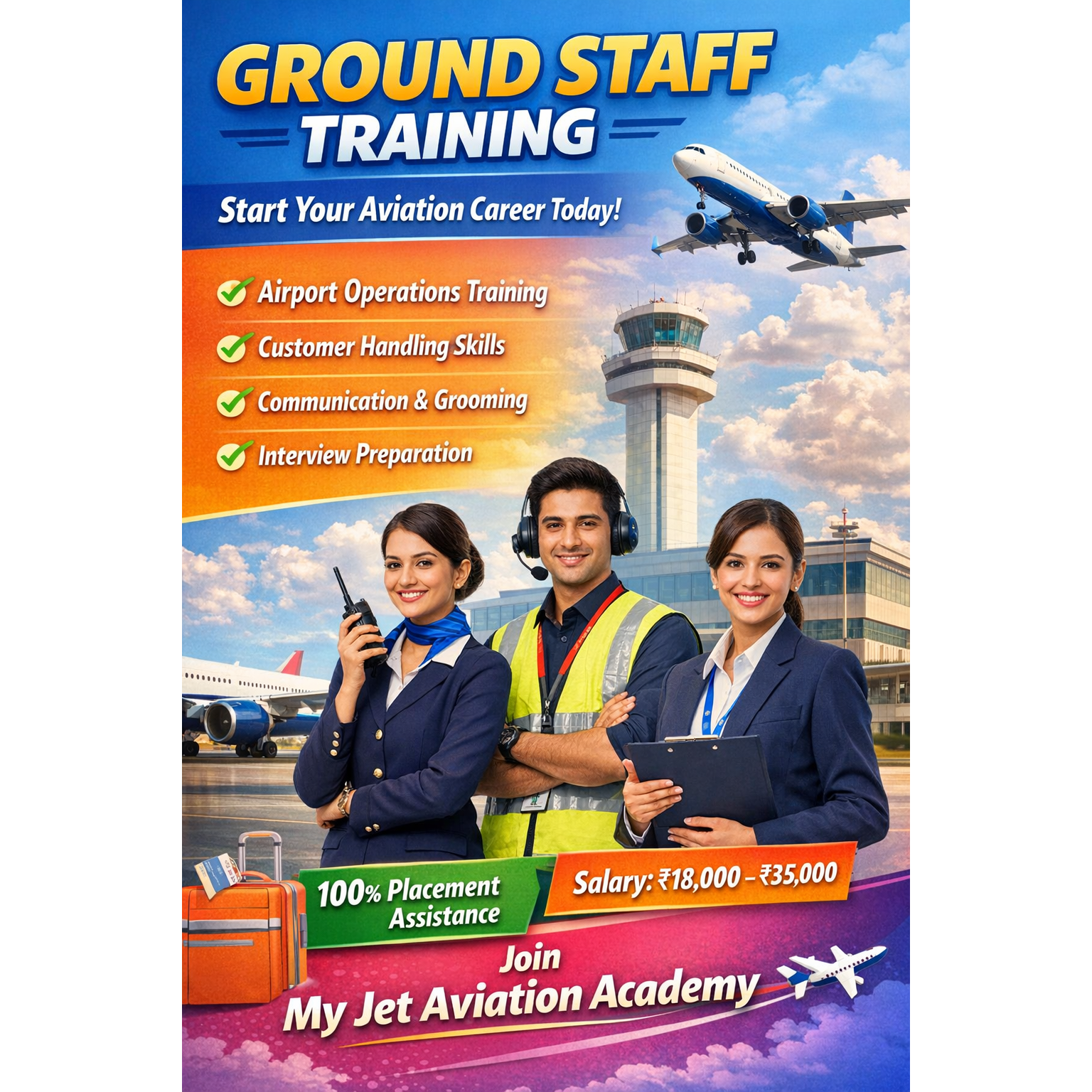 My Jet Aviation Academy brings you multiple career opportunities including Loader, Security, Ground Staff, and Customer Service roles. Training + Placement Support. Salary starts from ₹18, 000 to ₹35, 000 Don’t miss this chance — start your aviation career today! GROUND STAFF TRAINING Start Your Aviation Career Today! Airport Operations Training, Customer Handling Skills, Communication & Grooming, Interview Preparation Join My Jet Aviation Academy