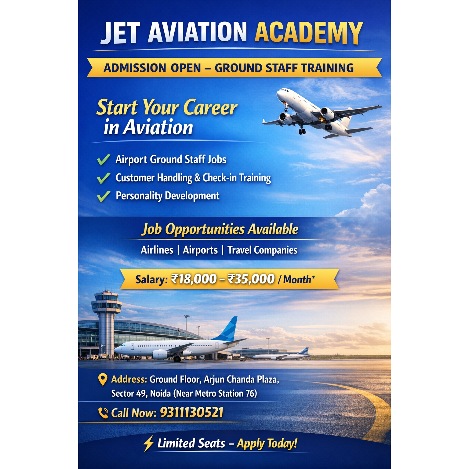 Number 1 Aviation Academy in Noida (Barola) for Ground staff Training. Ground staff are the people who handle airport operations on the ground. Training prepares you for roles like: Check-in & boarding assistance, Passenger handling, Baggage handling, Ticketing & reservations, Customer service at airport counters Why Choose This Career? Quick entry into aviation industry, Good starting salary (₹18, 000 – ₹35, 000/month in India), Opportunity to work with airlines and airports, Growth into senior roles like supervisor or duty manager, Exposure to international work environment What You Learn in Training? Airport operations & procedures, Communication skills & personality development, Customer handling & hospitality, Airline ticketing systems, Grooming & professional behavior Eligibility: 10+2 (minimum qualification), Basic English communication, Good personality & confidence Job Opportunities After training, you can apply for: Airlines (IndiGo, Air India, SpiceJet, etc.) Airport ground handling companies Travel agencies